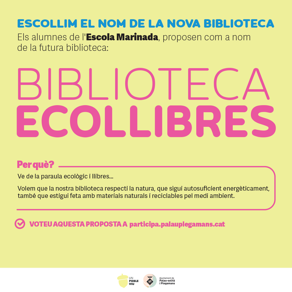 Els i les alumnes de l'escola Marinada proposen com a nom de la futura biblioteca: Biblioteca Ecollibres